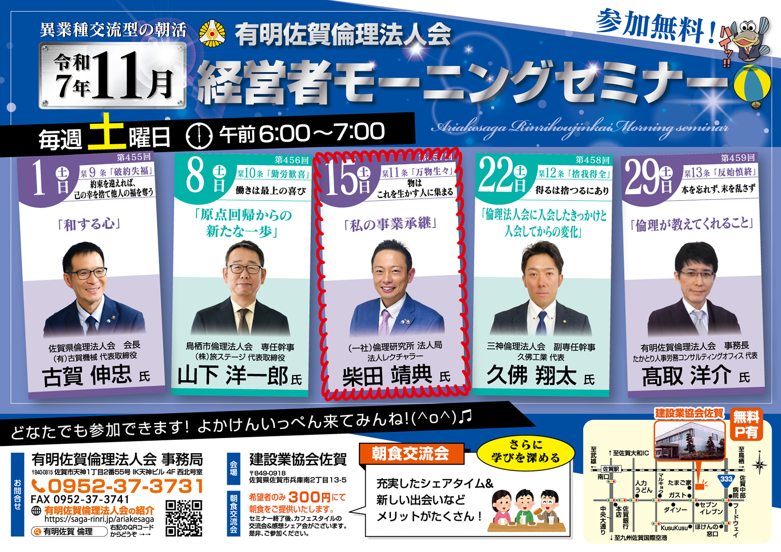 11/15(土)有明佐賀倫理法人会 経営者モーニングセミナーのお知らせです。